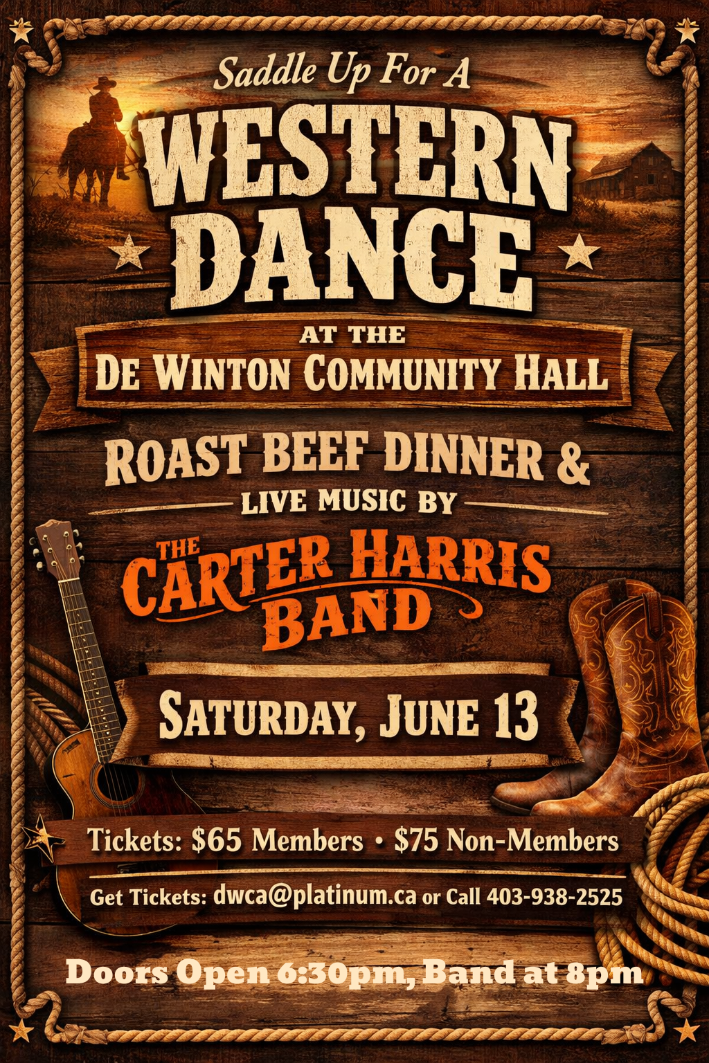 Dust off yer boots and join us for a lively evening of great food, music, and dancing! Doors open at 6:30 pm with dinner served at 7 pm, followed by live music and dancing starting at 8 pm. It’s a fantastic opportunity to connect with friends, meet neighbours, and enjoy a true western-style community celebration. All are welcome—bring your dancing spirit!
